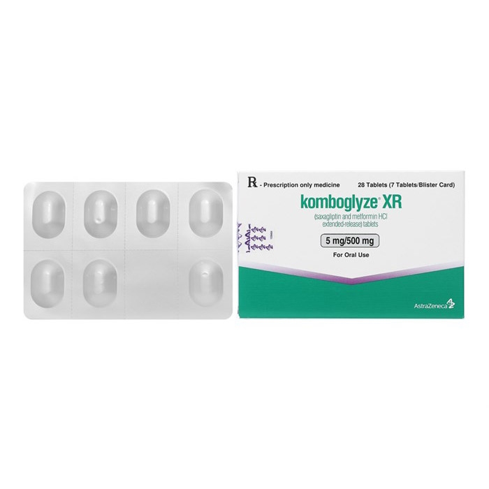 - Liều khởi đầu khuyến cáo của Komboglyze XR trên các bệnh nhân cần 5mg Saxagliptin và hiện tại chưa được điều trị với Metformin là 1 viên có hàm lượng 5mg Saxagliptin/500mg Metformin phóng thích kéo dài, uống 1 lần mỗi ngày với liều điều chỉnh tăng dần để giảm tác dụng phụ trên dạ dày – ruột gây ra do Metformin.
